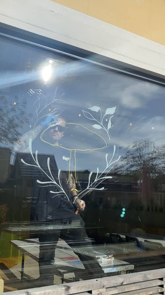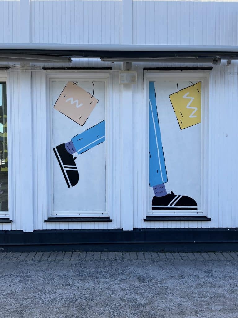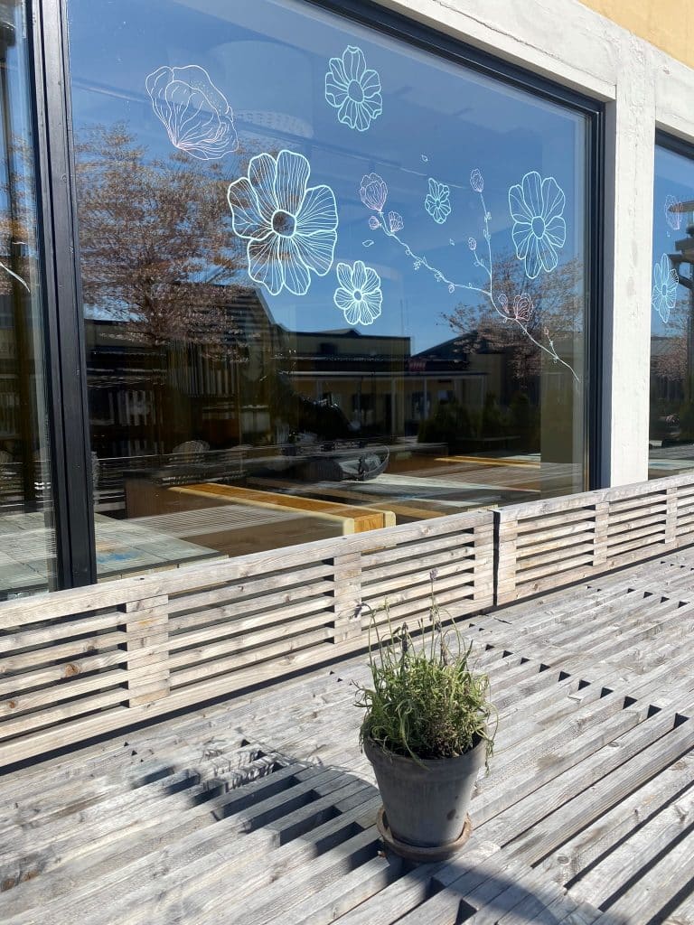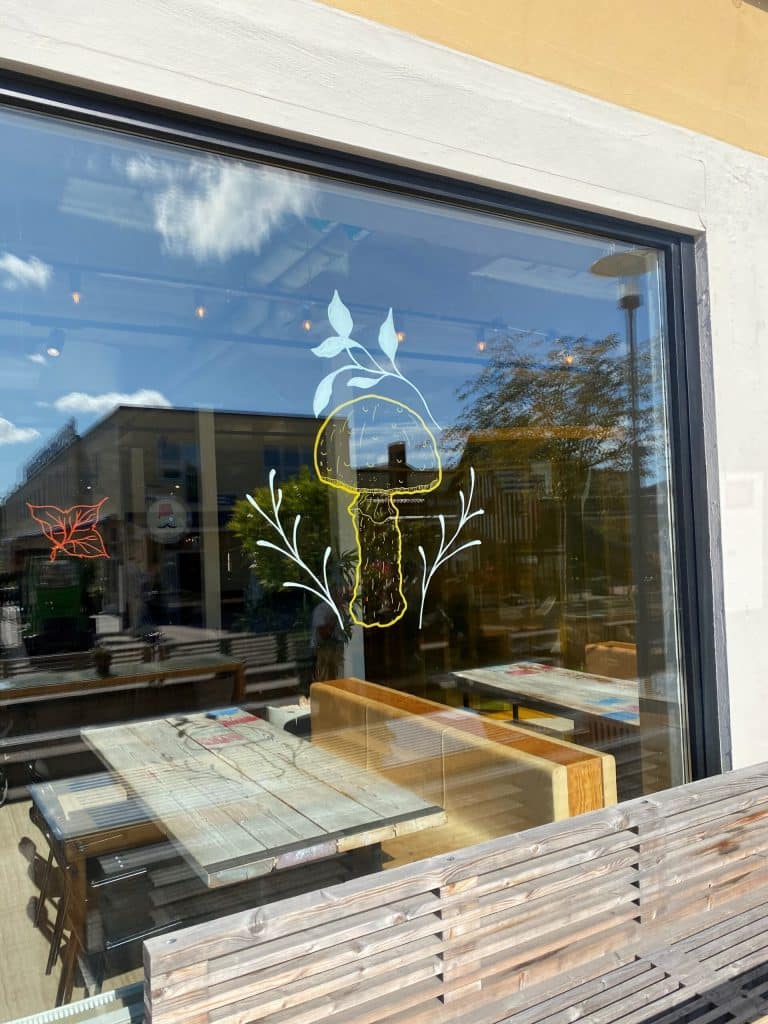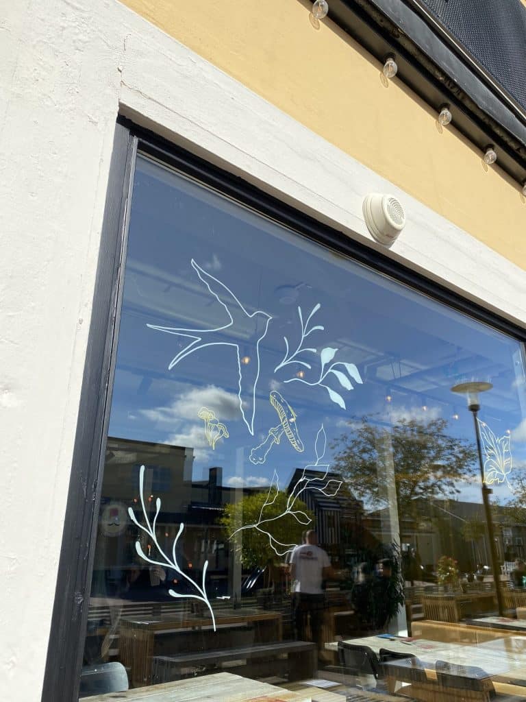 Flera fönster på området har handmålad konst på sig som är målad av klotterstudio. Även dessa anpassas efter säsong. Nedan ser ni bilder från vår Food Hall.